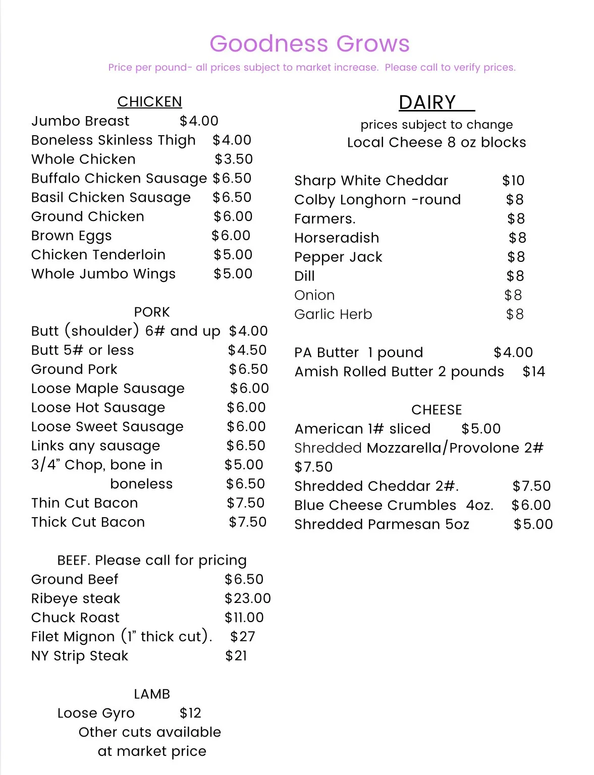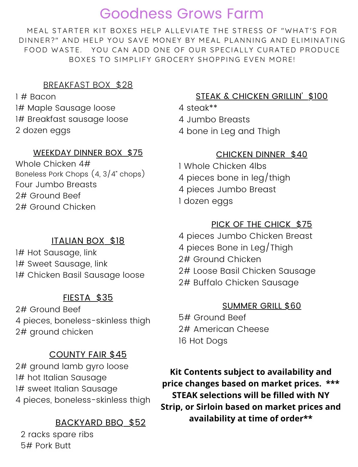 At Goodness Grows Farm We believe it can and should be easier to cook and eat locally. by offering a wide variety of locally sourced meats, cheeses and produce, we believe we can make a difference in our homes and in our communities. We raise and source as many local items as possible. All of our meats can be purchased by the pound or piece or in our Meat Boxes. We’ve also curated Meal Kits that feature a recipe card and pre-portioned ingredients designed to make a meal for four. you become the Chef, creating delicious meals in the comfort of your home. make sure to follow us on Facebook, Instagram, and tik Tok to Keep up with life on the farm!