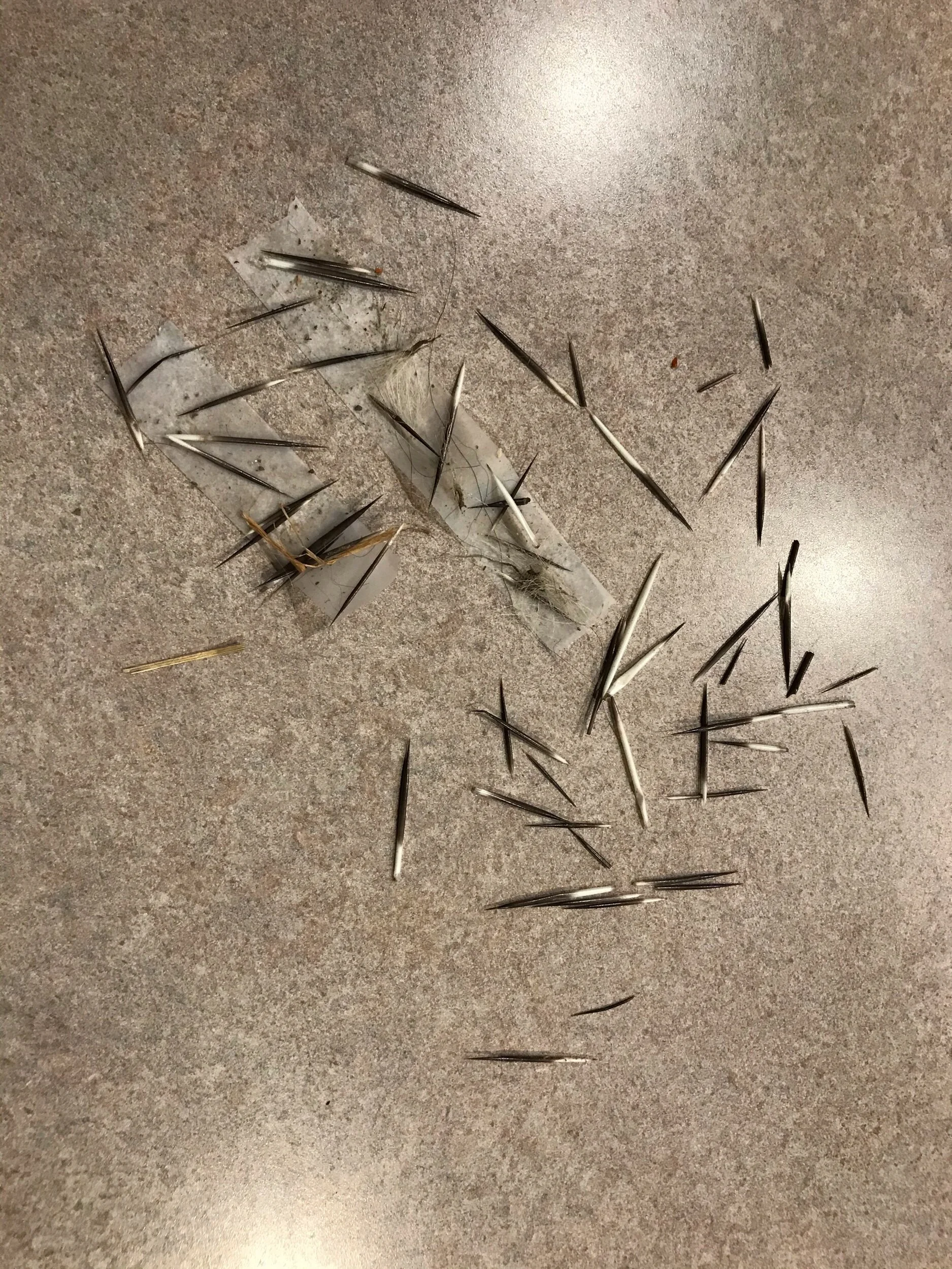 Unfortunately, what was up was that they, along with our Great Pyrenees livestock guard dog, Tate, had chased a porcupine had gotten quilled. Duke had gotten into one before, with our old Pyrenees, Bella, so he remembered to stay back. Both times happened on weekends when the only vets available were emergency. Extremely pricey and over an hour away. We knew what to do from the last time, and we knew there was no way we’d ever get three dogs in the car and be able to drive for an hour for a veterinarian to provide sedation, so we had to do it ourselves. Only problem was that last time, Erik was able to get down on the ground with the dogs to restrain them while #FarmerWalker pulled the quills out with pliers. The restraining portion would have to fall onto me. Olive had less than 10 quills so we started with her. She reluctantly allowed me to straddle her and hold her mouth open while Erik pulled the quills. She wasn’t happy but it was over in less than five minutes..